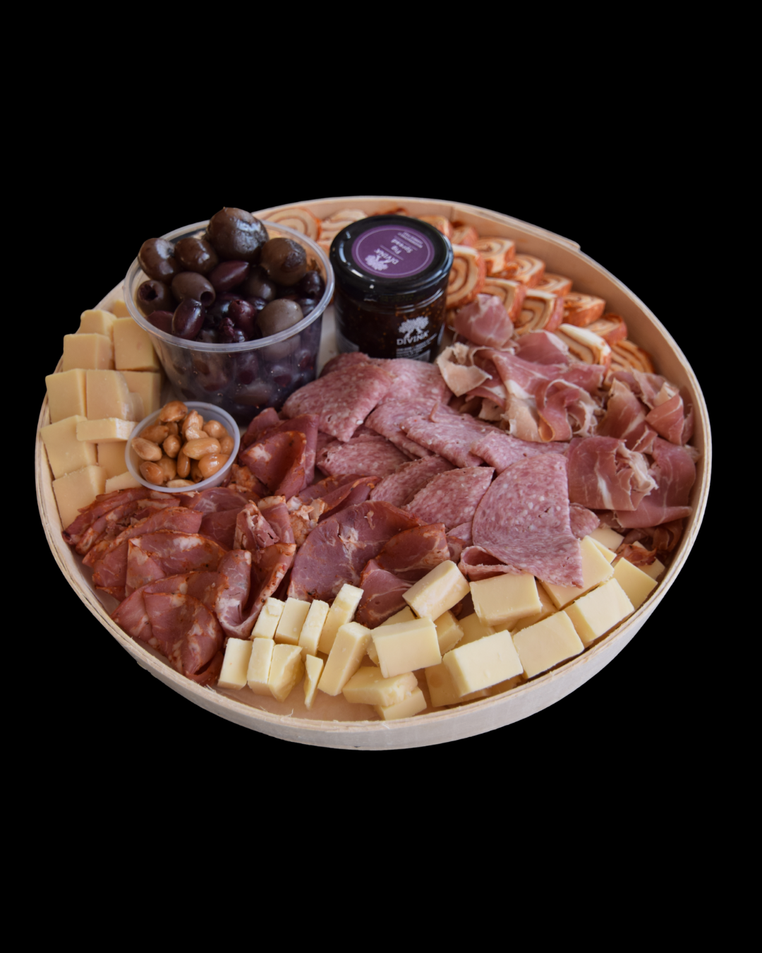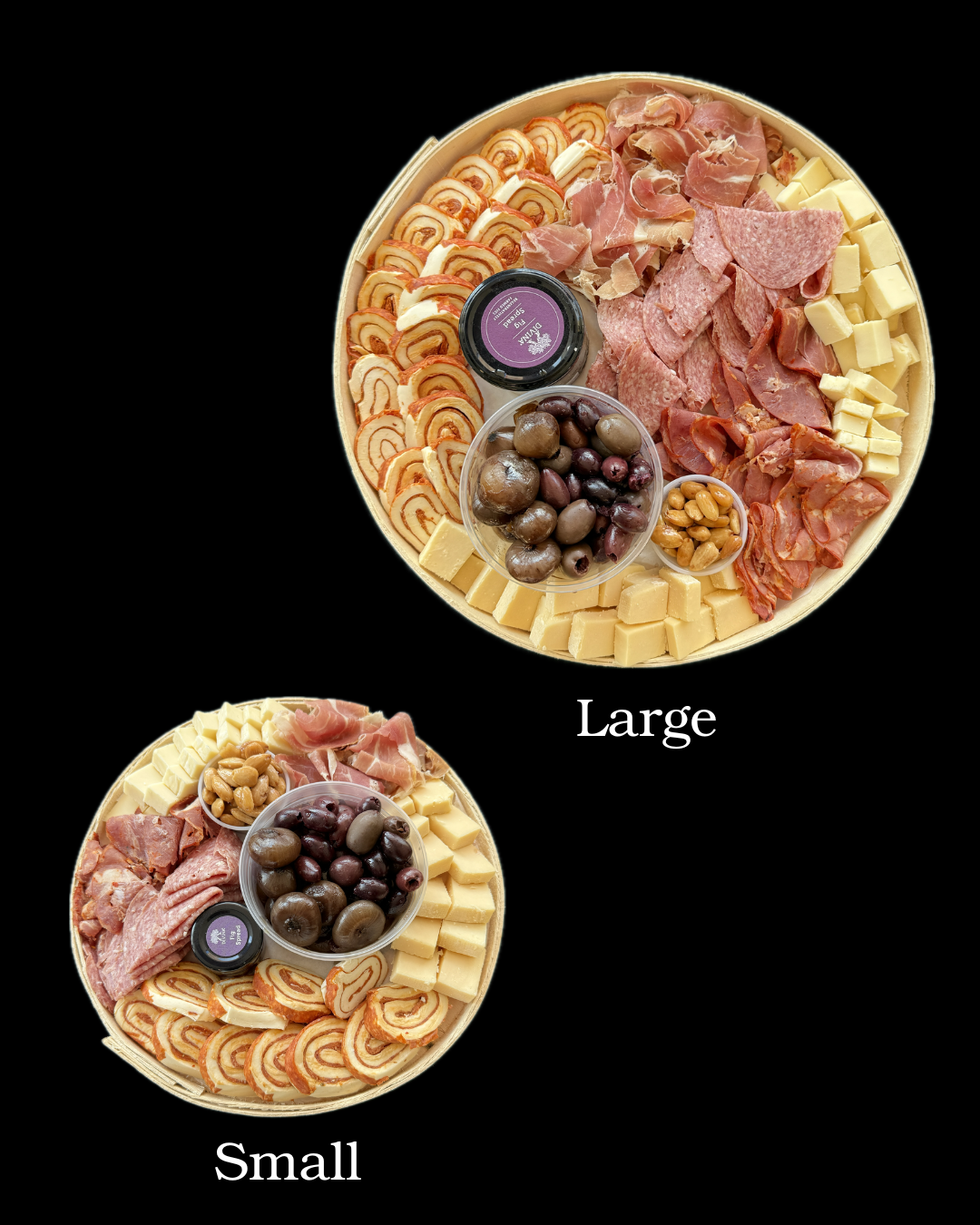 Both curated boards come with Sharp Cheddar & Imported Gouda as your cheeses along with a Prosciutto, Mozzarella & Basil Pinwheel Roll-Up. Genoa Salami, Old Fashioned Capicola & Prosciutto as your meats. Marcona Almonds, Imported Jam, Balsamic Onions, A Pitted Greek Olive Mix & Crackers as your accoutrements!